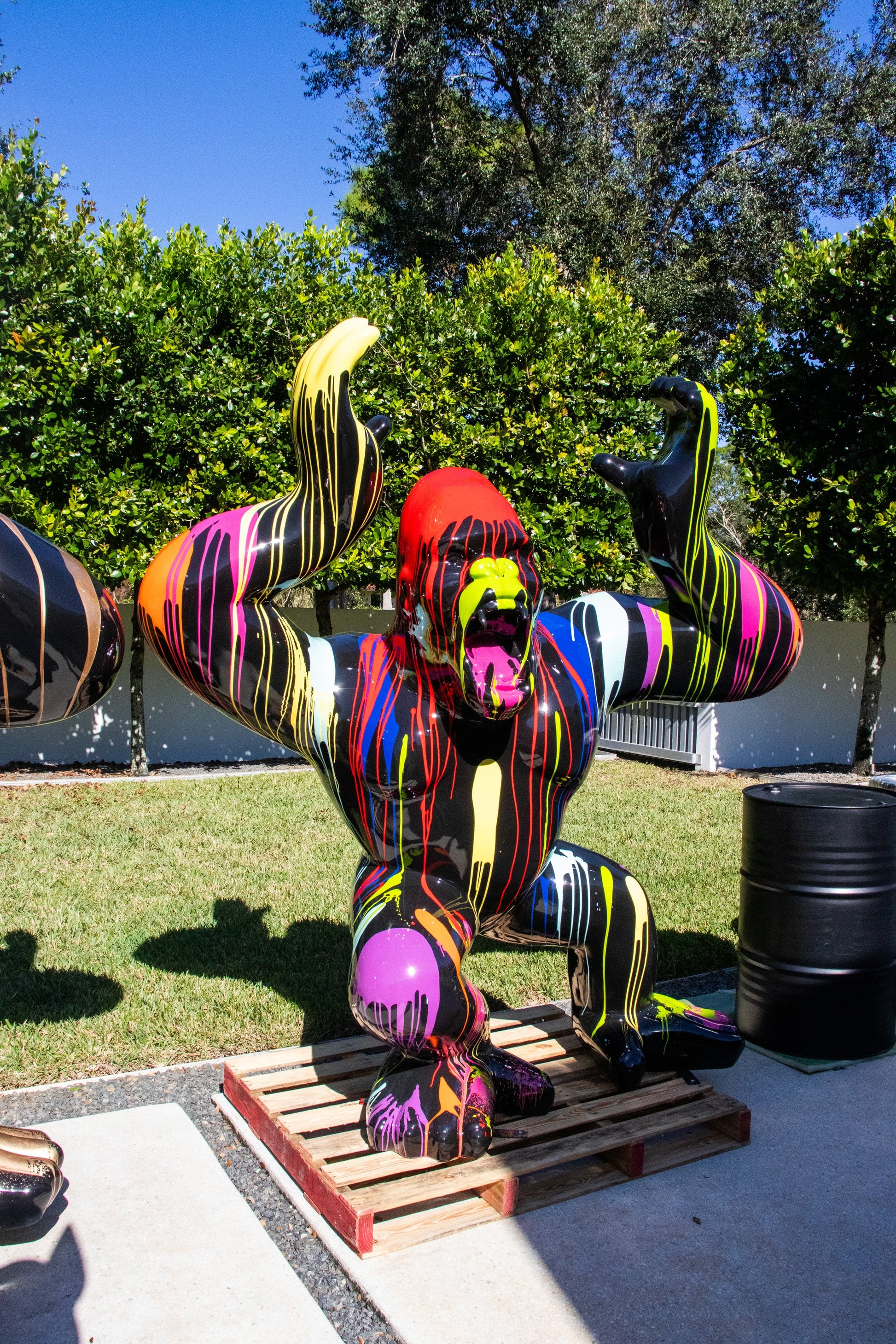 introducing our 95-inch gorilla sculpture holding a barrel over his head, a unique and playful piece of art. Crafted with lifelike textures and intricate muscle definition, it's built to last and is suitable for indoor and outdoor use. Whether in a living room or garden, this impressive sculpture is sure to become a focal point and spark conversation. Bring a touch of whimsy to your space with this stunning gorilla sculpture today!